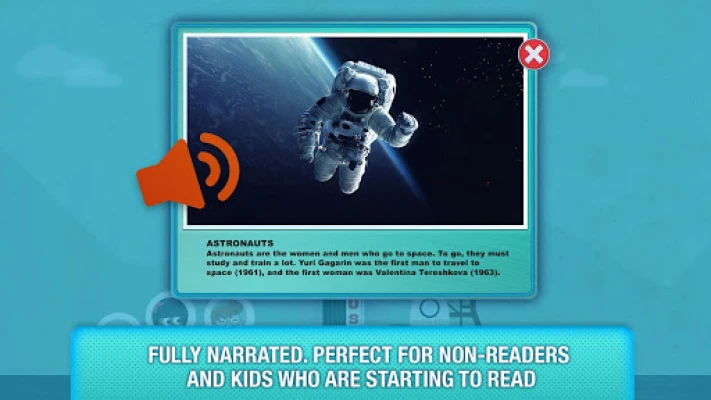 "What’s in Space?” It is the perfect app for curious children. With easy and simple narrated texts, educational games, and incredible illustrations, children will learn basic information about space: what planets are in the solar system, what each planet is like, the constellations that can be seen in the sky, the astronauts, the spaceships...